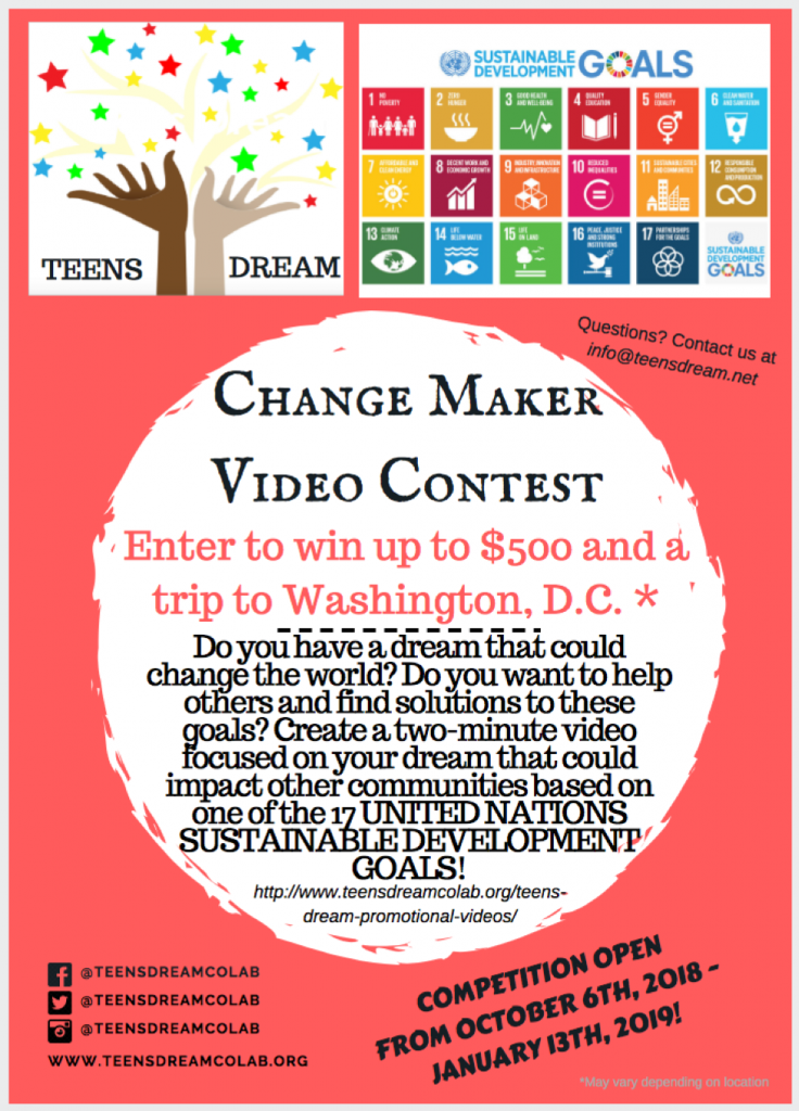 Calling all global teen change-makers to enter the annual Teens Dream Competition! If you are 13-18 and care about moving action forward on one or more of the United Nations Sustainable Development Goals (SDGs), then this simple video competition is for you! Teens Dream launched its 5th annual competition October 6th. Teens globally can submit a short 2-minute video on how they seek to impact one of the SDGs, until January 13th, 2019.